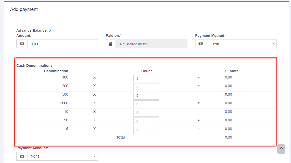 When a cashier closes the cash register it will ask to enter the count of each cash denomination. On entering total amount will be automatically calculated.