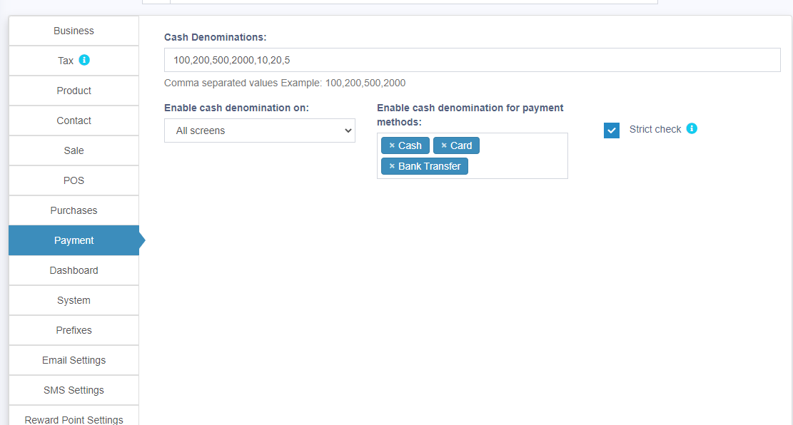Cash denominations can be added while making a sale or purchase. To enable this Go to Settings -> Payment.