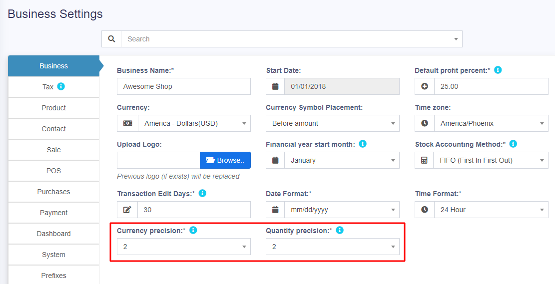 - 3. Change quantity_precision value to change the precision for quantity. The maximum is 4.