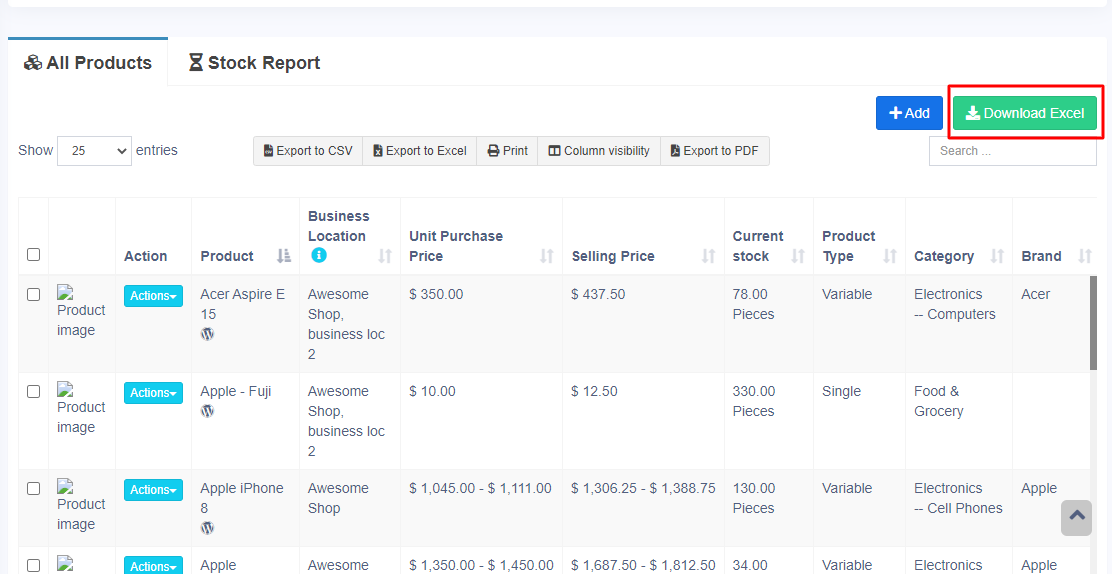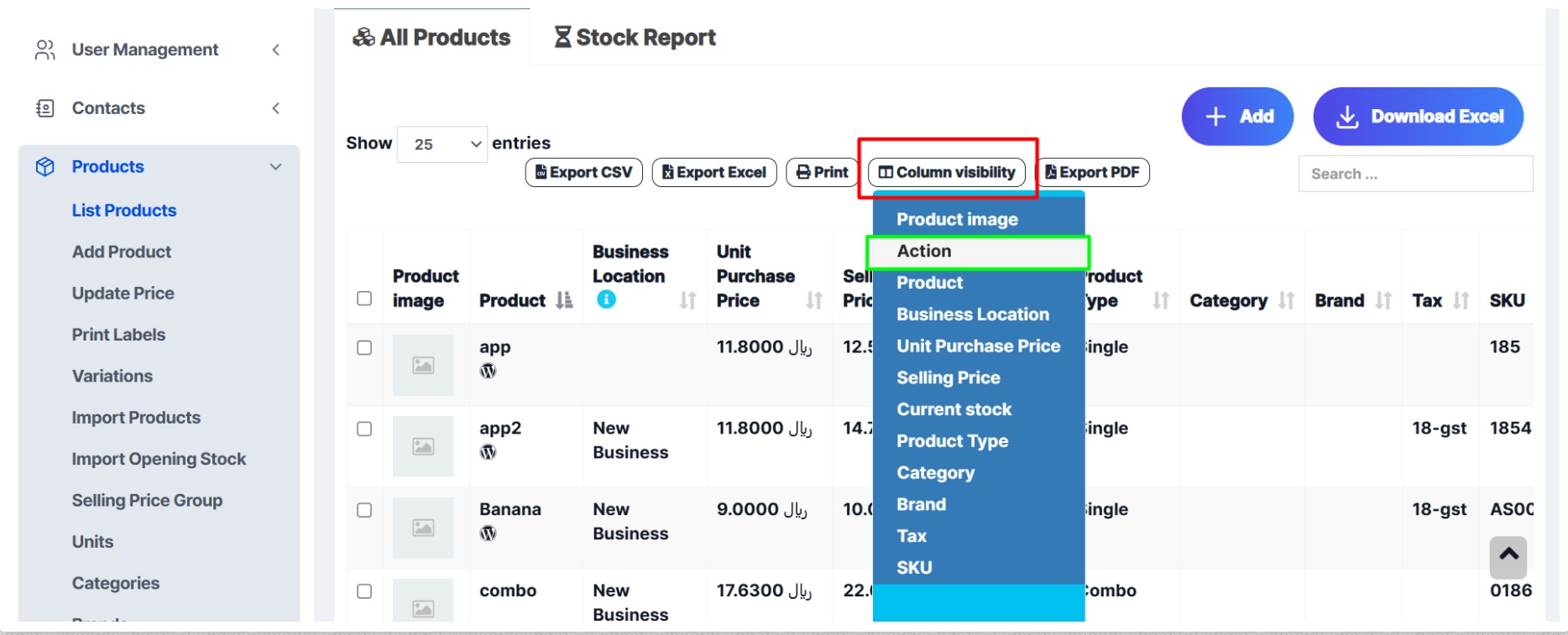 While you export the products list in excel, cv or pdf, the actions button column might be added in the exported files. In order to avoid this, use the column visibility feature and hide the actions button.