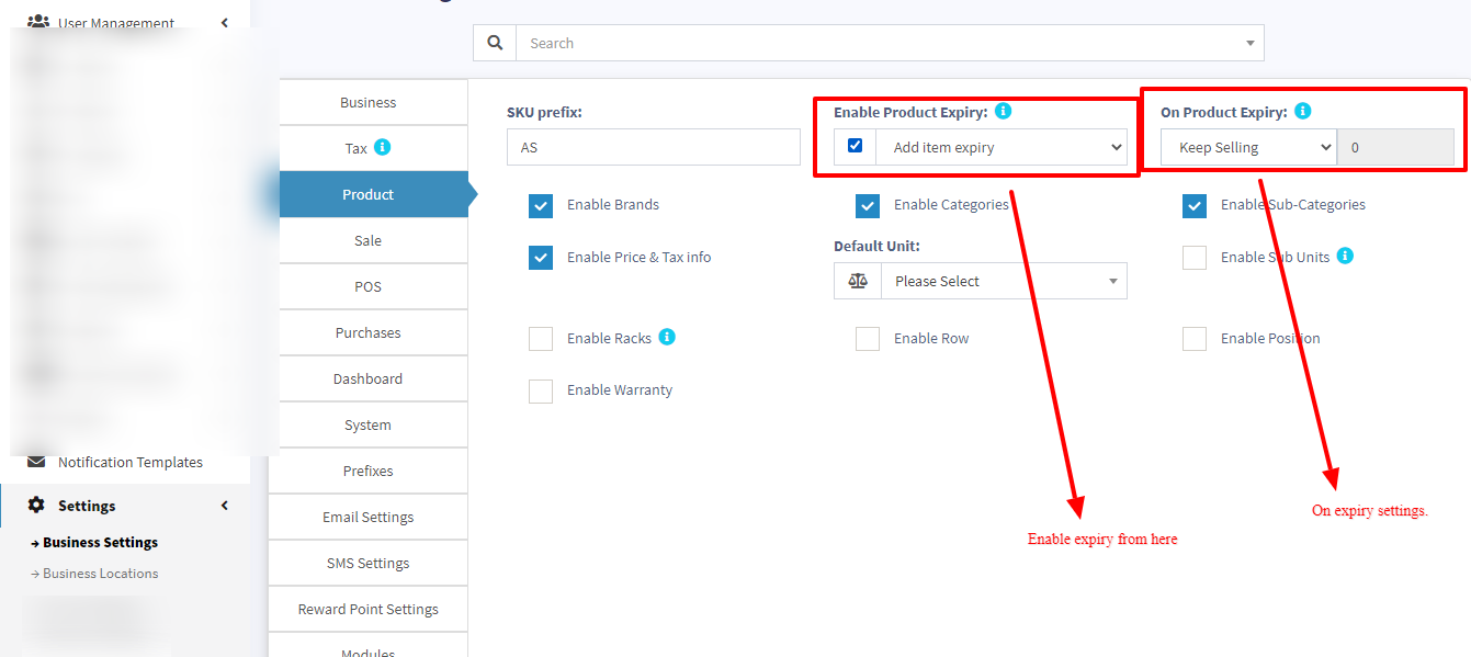 1. To enable expiry go to Settings -> Business Settings -> Product section. And check the “Enable Product Expiry” checkbox.