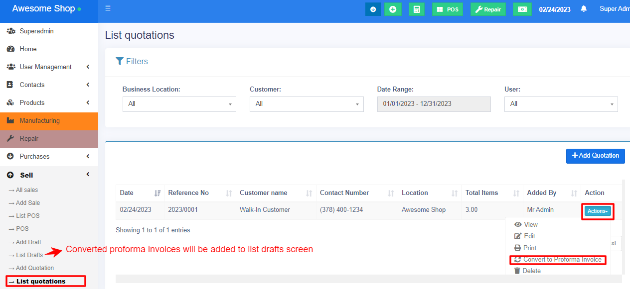 Select ‘Convert to proforma invoice’ from the action dropdown button on the list quotation page.