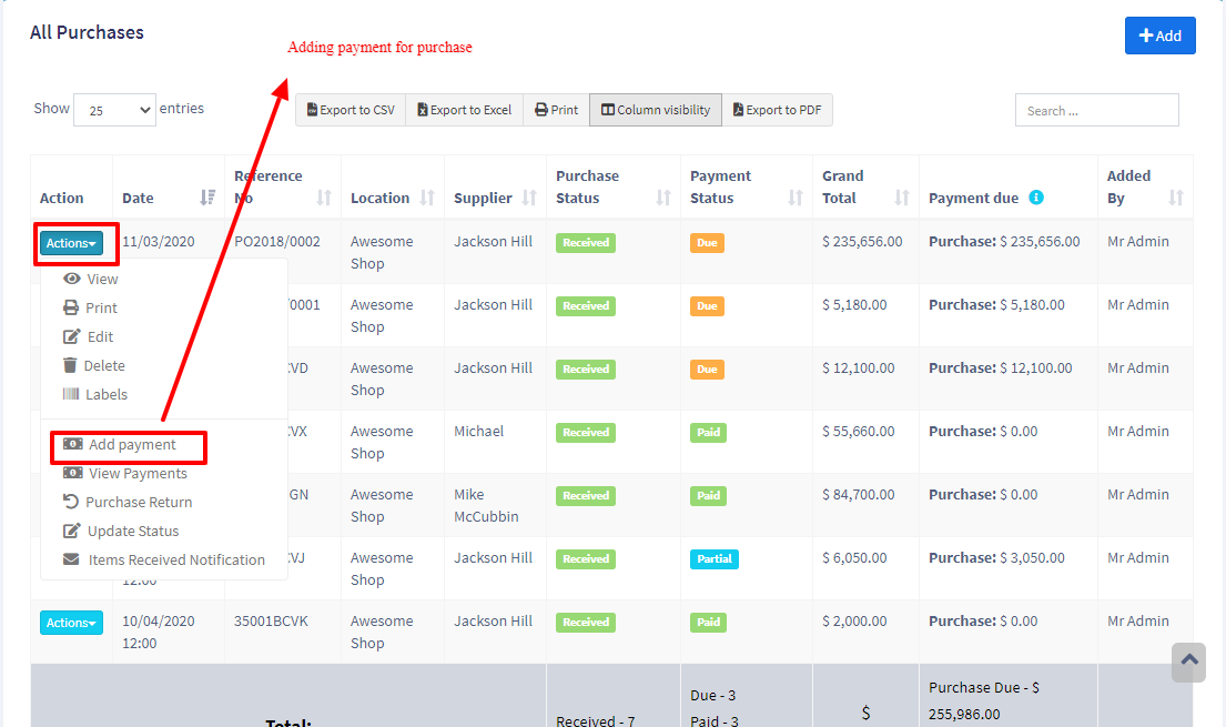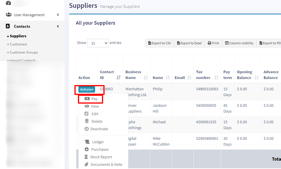 From list contacts screen, you can add payment for a supplier for all or multiple purchases at once.