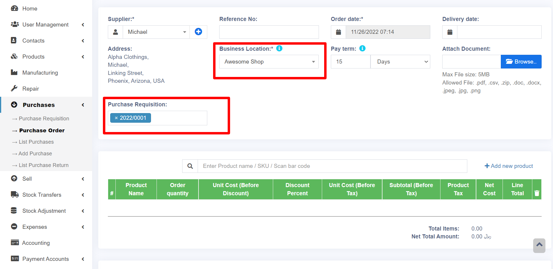 Only products less than the alert quantity will be shown while creating the purchase requisition.