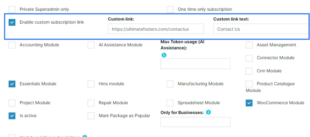 - Custom URL in package subscriptions: Custom URL for packages are external URLs. Using this link customers can contact you for a customized package for them. For example, something like “Contact Us” page for a Higher Enterprise package.