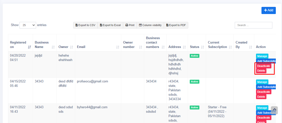 - 3. You can see all the businesses registered in the POS, Add a New business, Deactivate a business, or delete them completely.