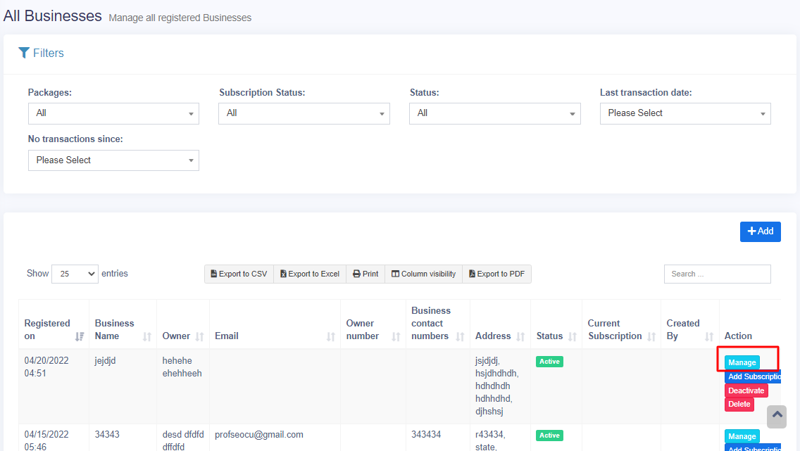 - Add, View, Deactivate or delete businesses.