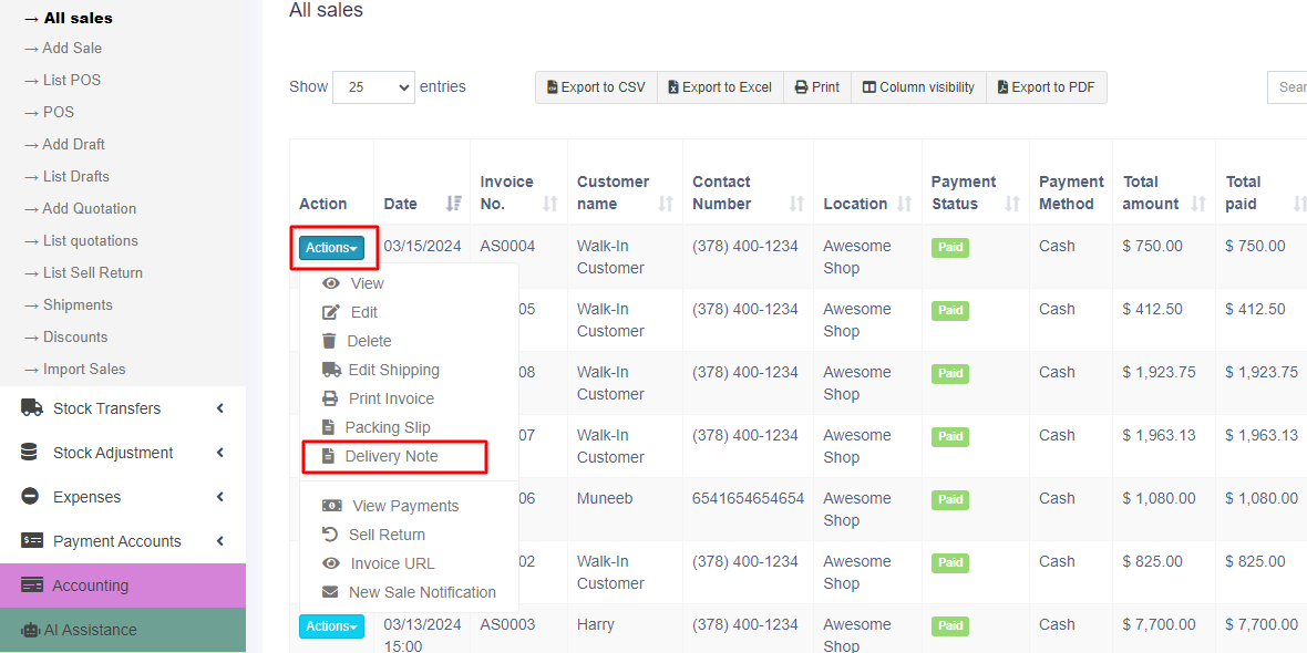 Step 3: From the Action dropdown menu, select the ‘Delivery Note‘ option, and proceed to print the delivery note directly.