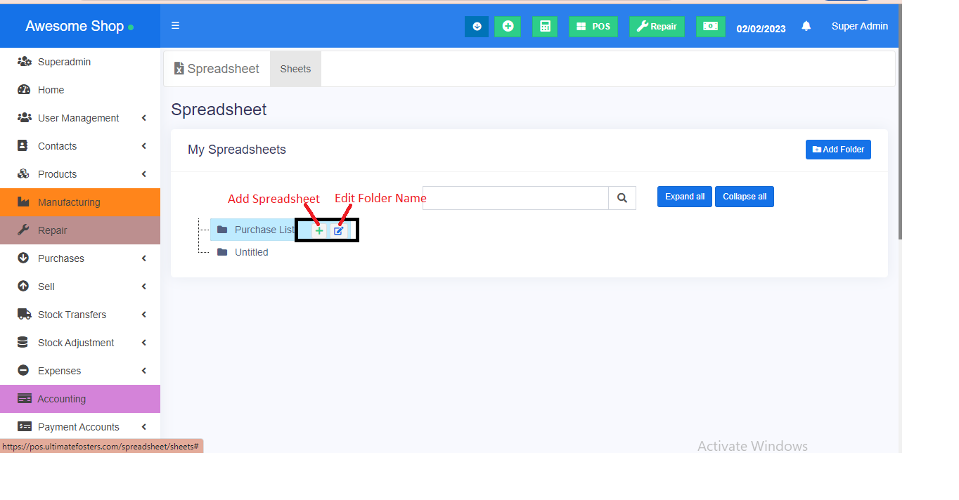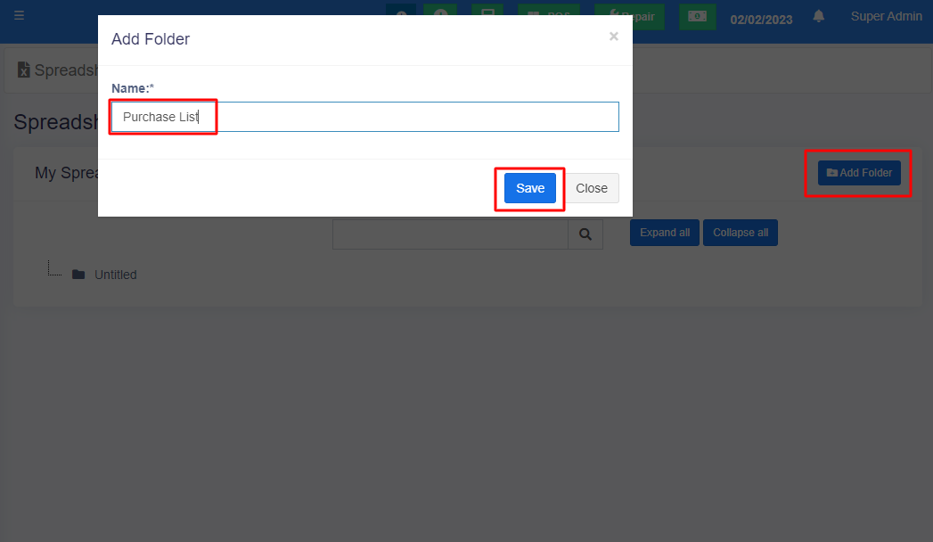 Once the folder is created, an option to create a spreadsheet under each folder is provided.