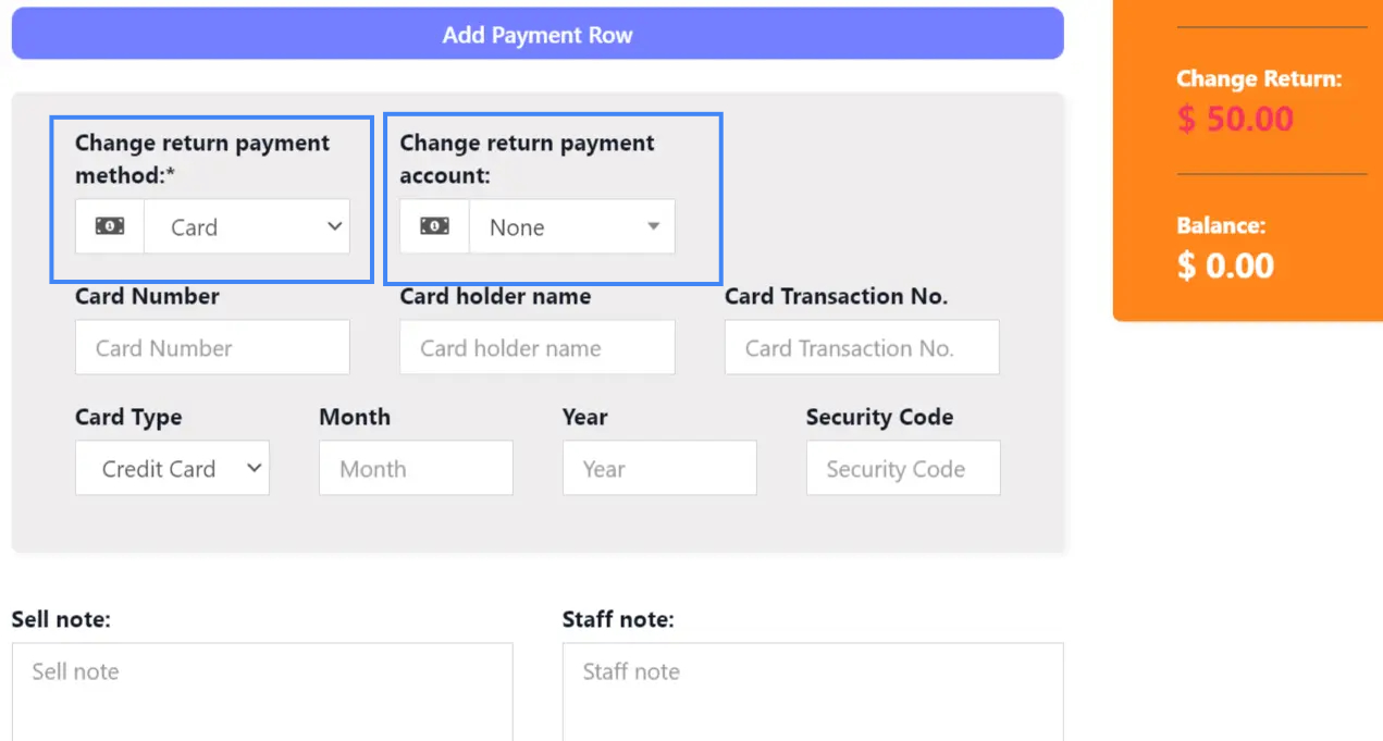 To add the payment method/payment account for change return, you can select the payment method/payment account in the Change return payment method and payment account dropboxs in the POS screen.