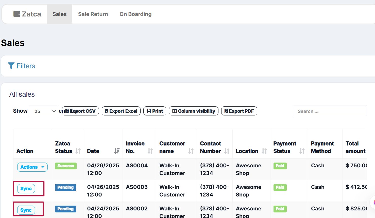 - 5. Now, if you go to either the Sale or Sale Return tab, you can sync the transaction with ZATCA by clicking the sync button.